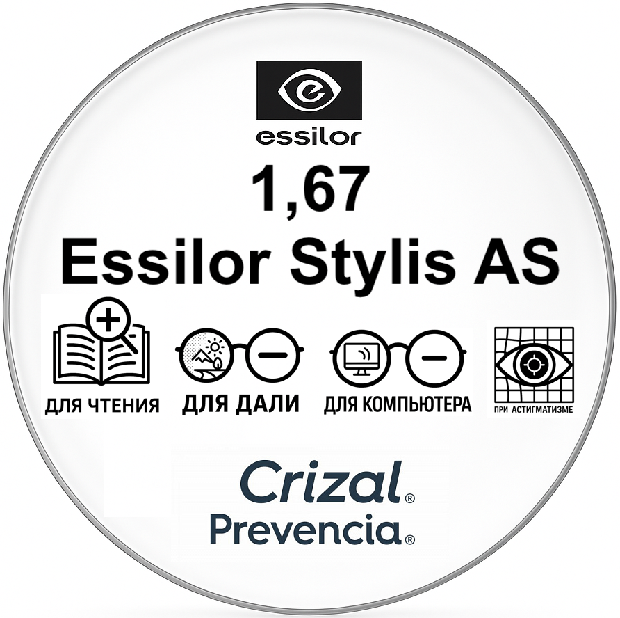 Essilor Stylis AS 1.67 — однофокальные асферические линзы премиум-класса с технологией Blue UV Capture. Они до 40% тоньше и значительно прочнее стандартных пластиковых линз, обеспечивая ультратонкий силуэт и современную эстетику. Подходят для установки в оправы всех типов: ободковые, полуободковые и безободковые.